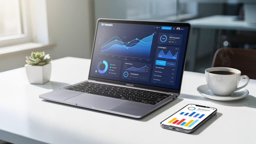 Marketer reviewing LinkedIn Campaign Manager analytics on desktop