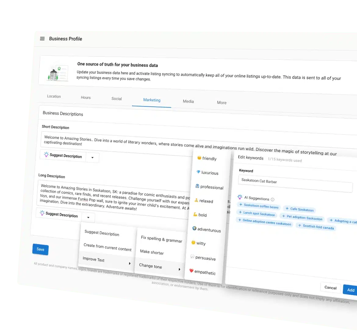Craft business profiles effortlessly with Vendasta’s local SEO software. Our AI-driven tool provides content suggestions based on the business name, location, and services. Ensure brand consistency and flawless content while engaging your client’s audience more effectively.